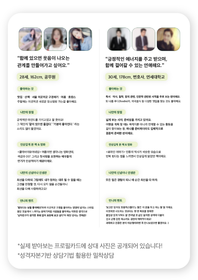그리고, 항상 저희가 가장 잘한다, 최고라고 생각하지 않습니다. 그렇기에, 더욱더 회원별 소개 방식을 세분화하고, 매칭의 만족도와 교제율을 높이기 위해 효과적인 상품과 전략은 없을지 고민하고 또 고민하고 있습니다.