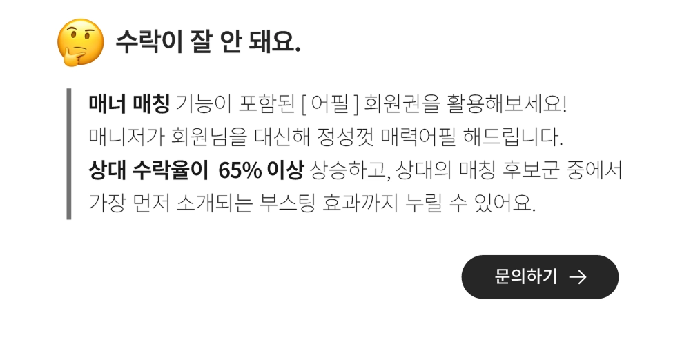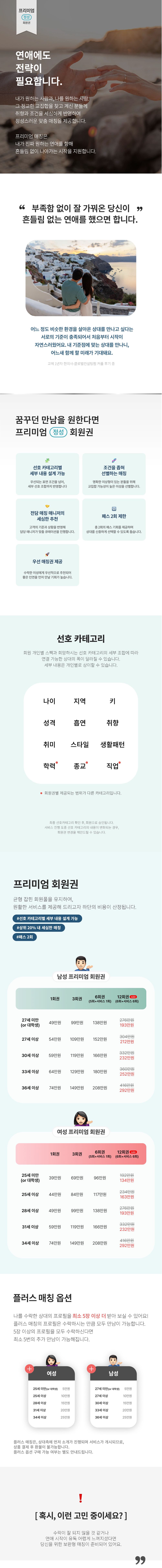 *회원권은 프로필등록 및 상담비가 포함된 가격입니다. 베이직 회원권의 경우, 여성회원 프로필등록 및 상담비는 25세 미만 50,000원, 25~27세 80,000원, 28~30세 120,000원, 31~33세 160,000원, 34세 이상 200,000원이며 남성회원 프로필등록 및 상담비는 27세 미만 100,000원, 27~29세 120,000원, 30~32세 140,000원, 33~35세 160,000원, 36세 이상 200,000원이며, 프리미엄 회원권의 경우, 여성회원 프로필등록 및 상담비는 25세 미만 190,000원, 25~27세 240,000원, 28~30세 300,000원, 31~33세 370,000원, 34세 이상 450,000원이며 남성회원 프로필등록 및 상담비는 27세 미만 290,000원, 27~29세 340,000원, 30~32세 390,000원, 33~35세 440,000원, 36세 이상 490,000원이며, 더블랙 회원권의 경우 여성회원 프로필등록 및 상담비는 590,000원, 남성회원 프로필등록 및 상담비는 690,000원이며, 매칭메이드 회원권의 경우 프로필등록 및 상담비는 150,000원이며(프로필촬영권 및 컨설팅 비용 등은 별도 문의), 어필 회원권의 경우 20대회원 프로필등록 및 상담비는 400,000원, 30대회원 500,000원, 어필매칭 600,000원입니다. *제휴사와 연계된 제휴상품의 경우 환불은 제휴사 약관에 따릅니다. *프로필카드 제작 및 첫 소개 등의 서비스의 제공기간은 2개월 내입니다. 개인별 이성상에 따라 진행속도의 편차가 큽니다.
